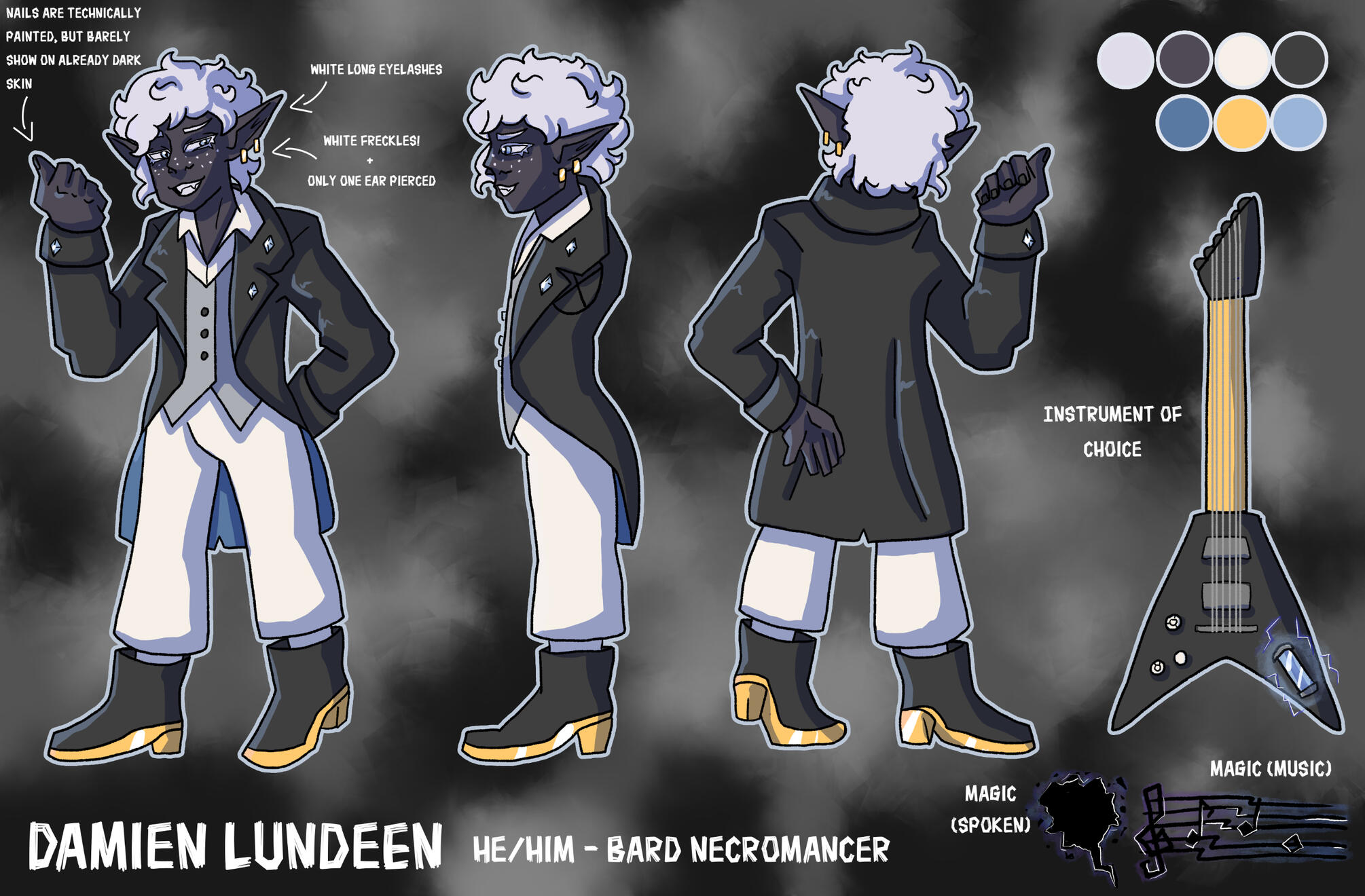 (He/him)Vain, flamboyant and exaggerated.A drow bard, and the proud inventor of "rock" music (because the strings are made of metal, and metal is a rock; he's not had an education, let him be.)He is fascinated by music and necromancy.