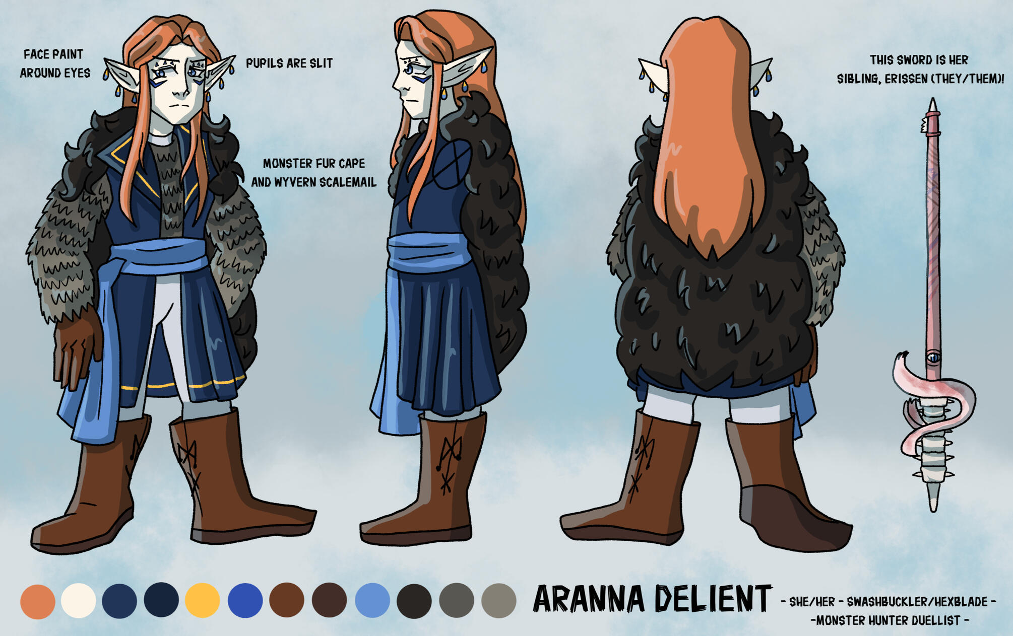 (She/her)Once a duellist, Aranna turned to monster hunting after her twin sibling was warped into a sword made of their own flesh by the White Which.She seeks out magical and powerful creatures to train against, in hopes of slaying the Witch and returning her sibling to normal someday.