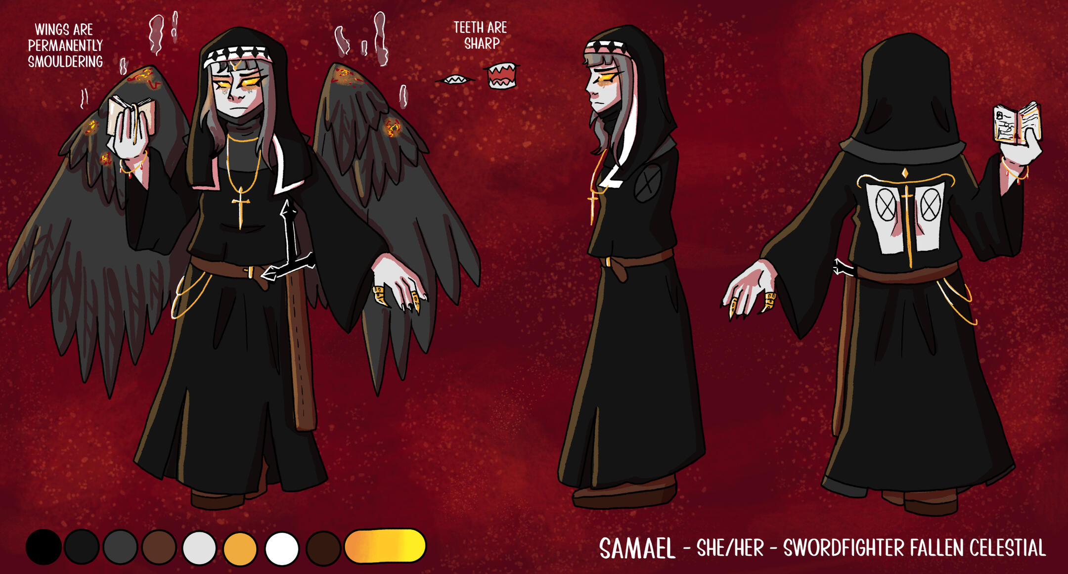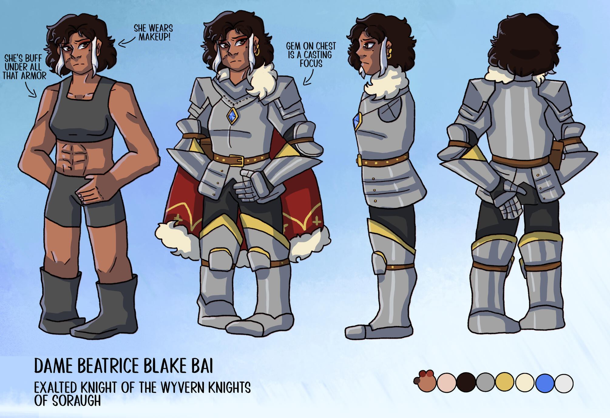 (She/her)My DND character for a shorter but very intense campaign!A sun godess' acolyte turned Vampire Spawn by a nobleman, her goddess left her the parting gift of being able to withstand sunlight.Her designs show the progression from acolyte to spawn, then to runaway warlock, and finally to a knightly paladin of her goddess.