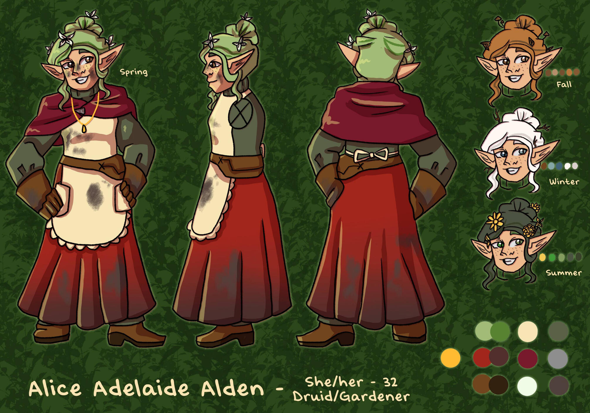 (She/her)A bizarre elven gardener, exchanged by trickster fey with a Soraughdign child.She has a natural affinity for plants, which she harnesses into magic. She's capable of up-keeping near-tropical gardens in the frigid northern weather.